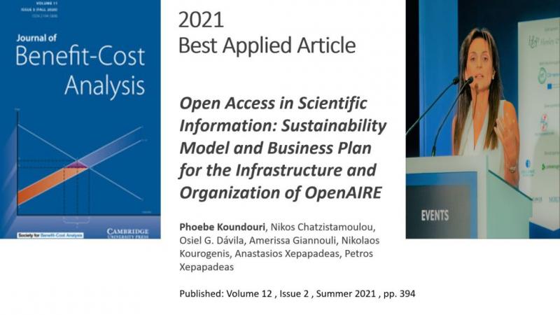 Best Applied Article: Koundouri, P., Chatzistamoulou, N., Dávila, O., Giannouli, A., Kourogenis, N., Xepapadeas, A., & Xepapadeas, P. (2021). Open Access in Scientific Information: Sustainability Model and Business Plan for the Infrastructure and Organization of OpenAIRE. Journal of Benefit-Cost Analysis, 12(1), 170-198. https://doi.org/10.1017/bca.2020.26